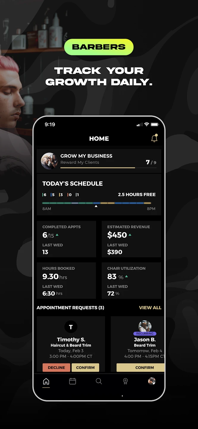 Designed for multi-chair shops with team lead management tools. Offers guided walk-throughs of appointment statuses and deep analytics integration with Google My Business. |